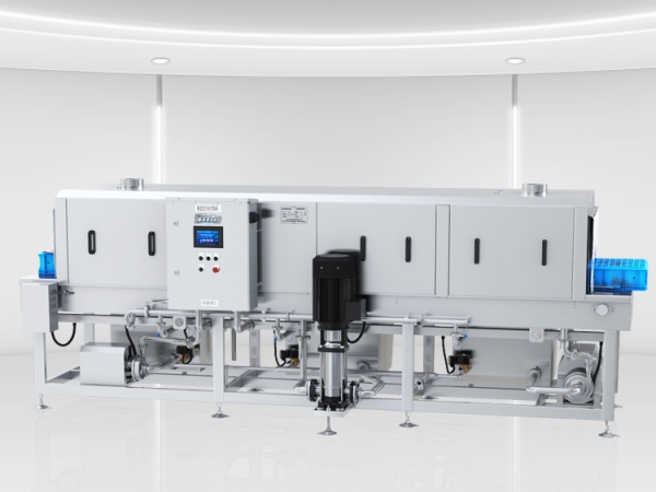不銹鋼周轉箱清洗機預洗過程是水泵將水從預洗水箱中吸出,經噴嘴噴出,使食品或容器具各面收到清洗,洗掉雜物,清洗后的污水經過濾分離流回水箱,雜物排出。主清洗過程是水泵將溫水從主清洗水箱中吸出,經噴嘴噴出,使食品或容器具各面受到清洗,清洗掉剩余雜物及油污,清洗后的污水經過濾分離流回水箱,雜物排出。無菌洗箱機漂清過程是漂洗水泵將熱水從漂洗水箱中吸出,經噴嘴噴出,將被清洗物上的清洗劑等漂洗掉,同時對清洗物進行消毒,水流至主清洗水箱。洗箱機輸送系統采用變頻調速電機帶動,調節電機速度以控制清洗時間。該機側導向機構可調以,適應不同規格清洗物品。